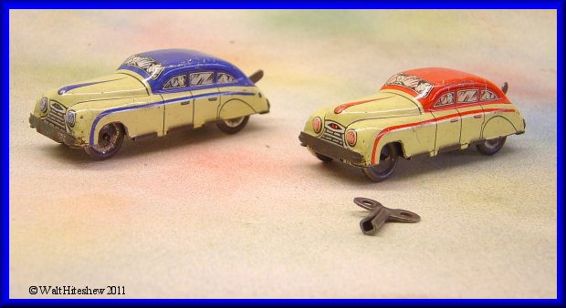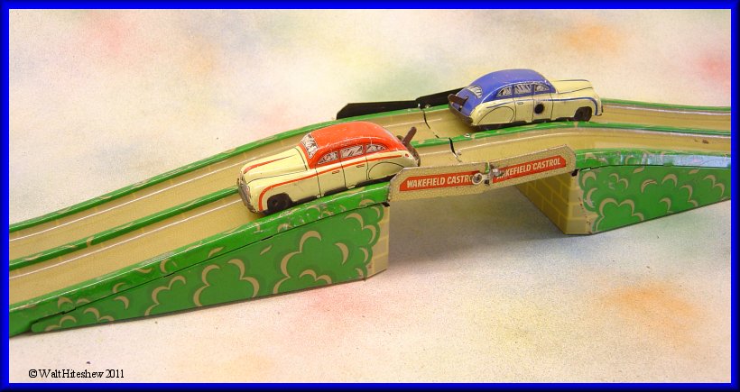 NOTES------------Beautiful clockwork road race set from the fifties with dual lane lithographed track. Made in England. I have alway believed this to be Tippco but now that I am offering it for sale I don't recall why. No markings other than made in England on track and British Made on cars.