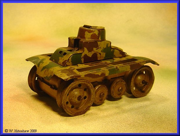 NOTE-------------Well made tin litho tank with sparkling mechanism and hinged turret top. Probably German and my guess would be pre-war.
