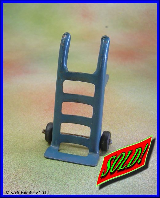NOTES-------------Wooden wheeled hand truck from one of the stations. Blue is a less common color. Typically red. 3-1/2"tall.