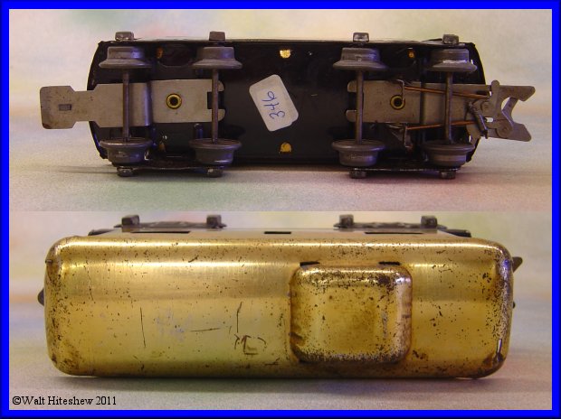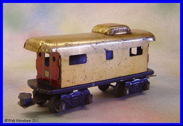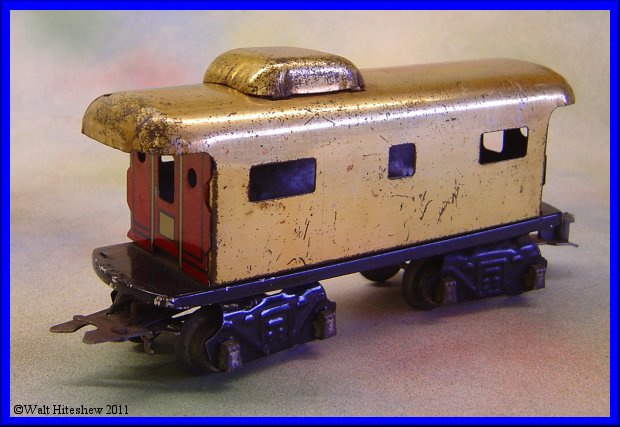 NOTES------------This caboose first surfaced in the mid nineties. I purchased it at the time knowing it was something that could not be faked. Although it is not lettered as a prototype there is no doubt this came from the Marx R&D department. Discussions between Marx collectors have concluded this was probably fabricated at the time Marx produced the copper/brass CP engine and tender. They were probably considering a caboose to match the set. Why it never got past the R&D department is unknown but it is likely they rejected it as too gaudy. There is no doubt about this item originating at Marx and not in some collector's basement. The slot for Joy Line couplers on the ends indicates this to be from the 1938 era, just when it would be expected. The body and cupola are regular stampings but from the brass/copper sheet as used on the brass/copper tenders. Ends, frame, trucks, and couplers are regular production.