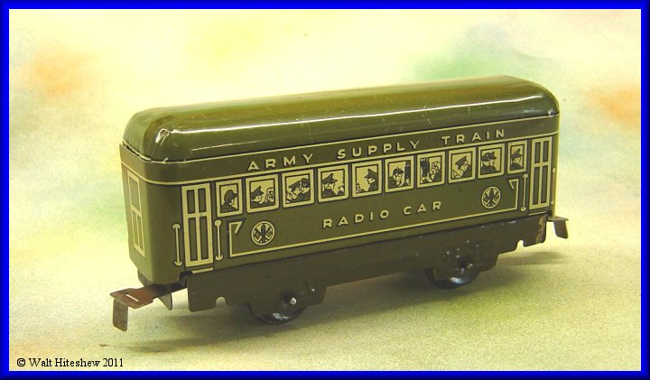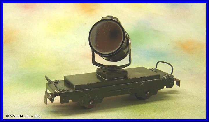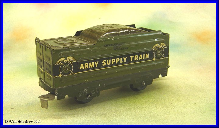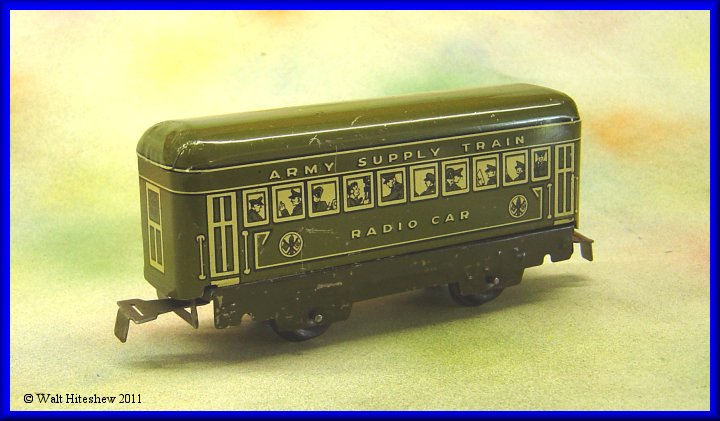 NOTES---------Rarest of the Military sets. The most common piece in this set is the Army Supply Train wedge tender and that is certainly not a common piece. Dummy searchlight, A-A Gun and Radio car with sliding tab and slot couplers cannot be faked. Very rare set and a gem in any Marx collection.