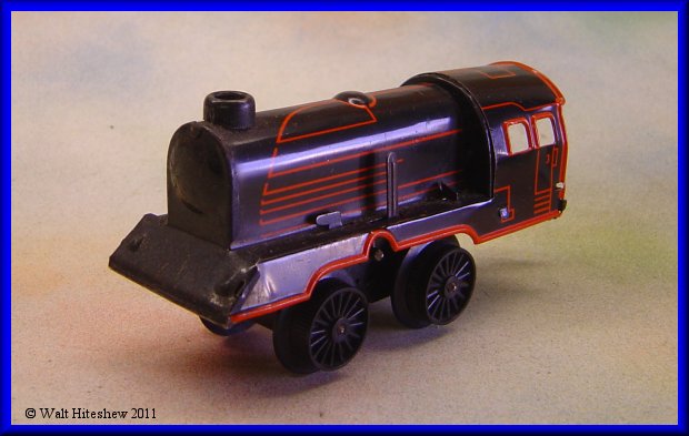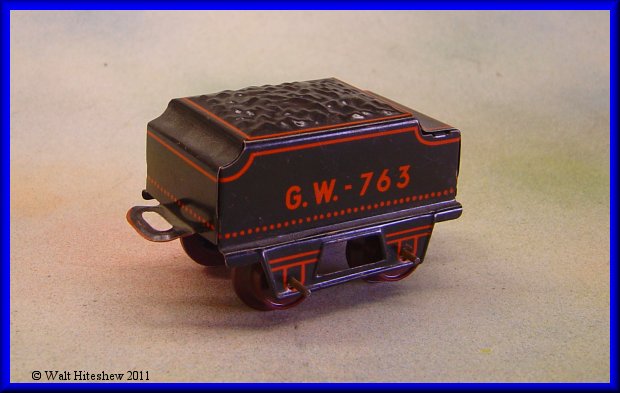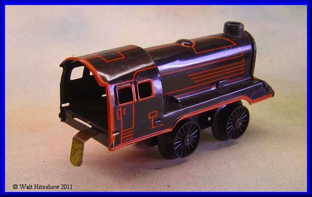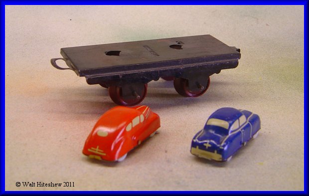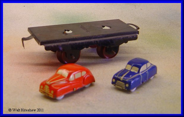 NOTE--------------Adorable little postwar O gauge German set put together from accumulated pieces. This set probably is legit but I purchased the items separately. The consist is similar to boxed sets I have in my collection. Set measures 13-1/2" total. Little automobiles are held in place by rubberbands which have deteriorated away. Remnants left underneath flat.