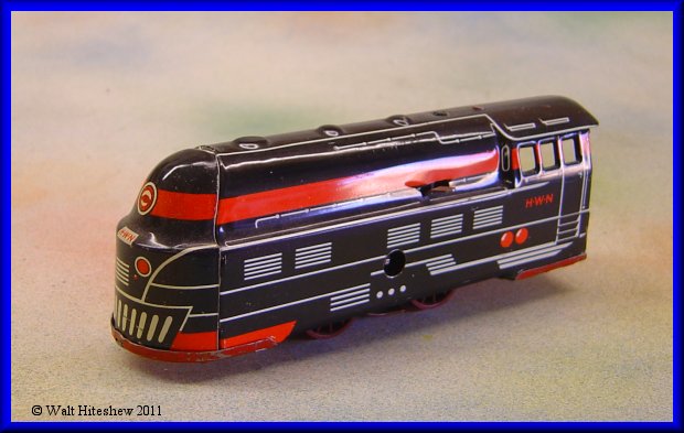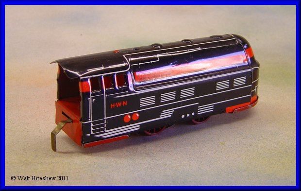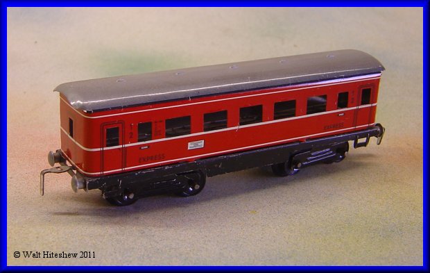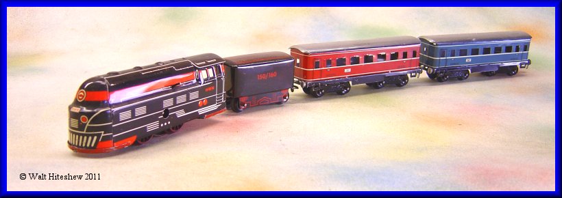 NOTE--------------Adorable little postwar HO gauge German set Set measures 20" total. Cars have articulated trucks (or bogies in the European parlance).