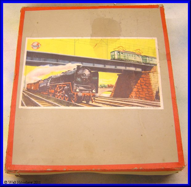 CONDITION-----EXCELLENT MINUS. Set shows minor signs of playwear. Slightly been roof corners, very light scratching, light oxidation to track. Box top has waterstain and has been reinforced with cardstock at three corners. Still, a beautiful example of West German toy train manufacture of the export market.