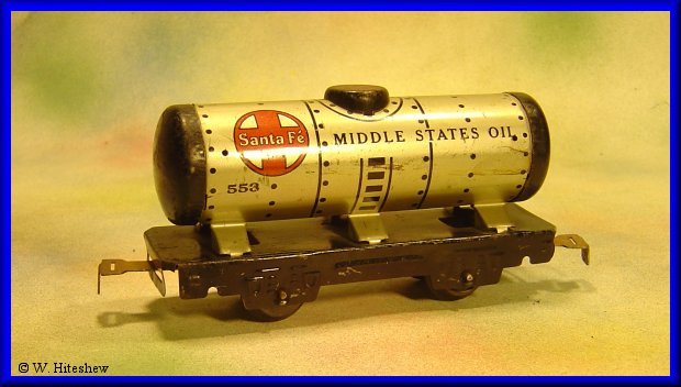 NOTES------------Rare car with black painted ends and dome, produced either 1940 or 40 only when tin was in short supply. Frame is thinner sheet metal indicating reused body material. Black wheels. This is the only one of these I have seen from a clockwork set.