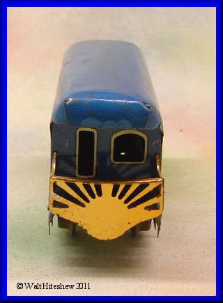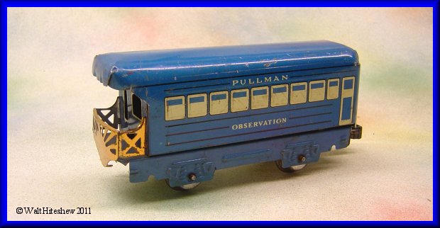 NOTES------------Marx blue passenger cars have always been hard to find. Sold with the blue Mercury sets in the early 1950s, they typically are equipped with sliding tab and slot couplers. This one, with plastic knuckle couplers, is an over-the-counter item, not included in a set. Very hard to find, I have only seen a few of these in twenty plus years of collectng Marx trains. Also somewhat odd is the blue frame. Blue frames are generally found in sets which were all clockwork and would have been equipped with sliding tab and slot couplers. OTC cars usually have black frames.
