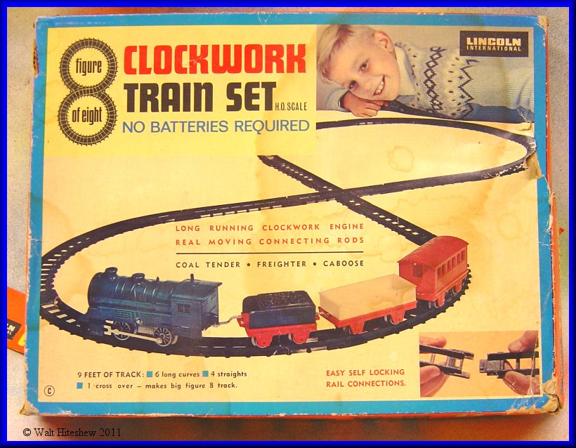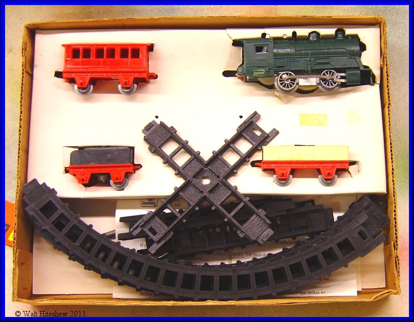NOTES-------------Interesting and unusual small plastic set, probably from the fifties. Nonimally HO. These are usually battery ops but this one has a nice strong clockwork motor.