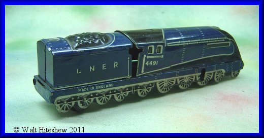 NOTES-------------Clockwork powered floor toy engine made England probably postwar, I would guess 1950's by the design. 9" Long. Manufacturer unknown but I suspect Mettoy.