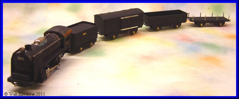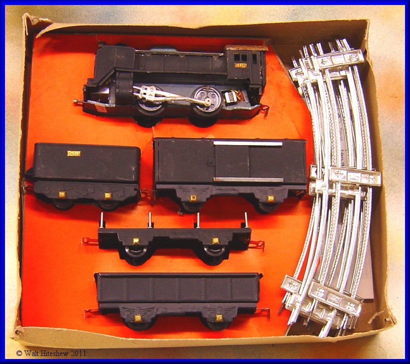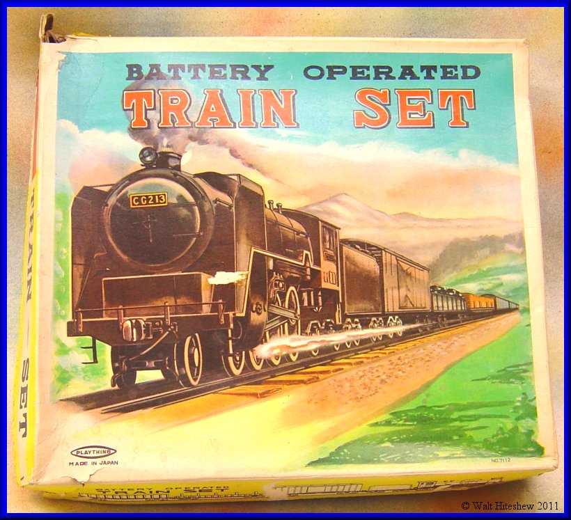 NOTES-------------One of the most unusual japanese train sets I have seen. All flat black with bright tin and gold details! In an age when Japanese lithography was just fantastic this set seems completely off the wall.