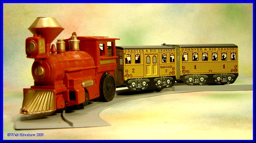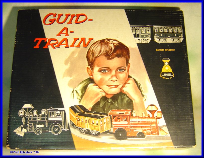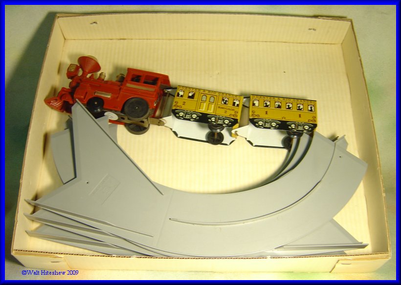 guide the train wherever he chose by strategically placing the track sections where the train would be turned 90 degrees on its course. Includes plastic engine, two lithographed cars and six sections of track.
