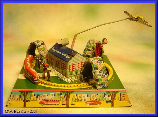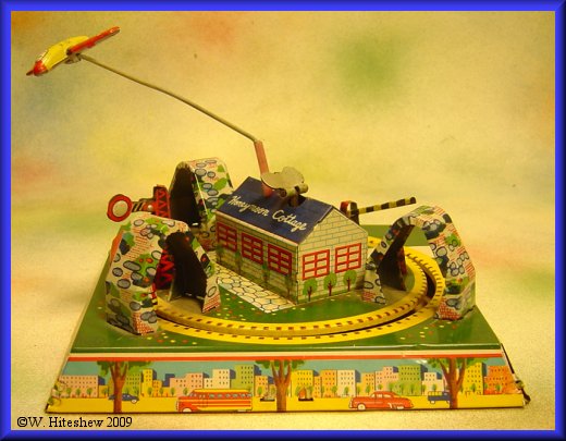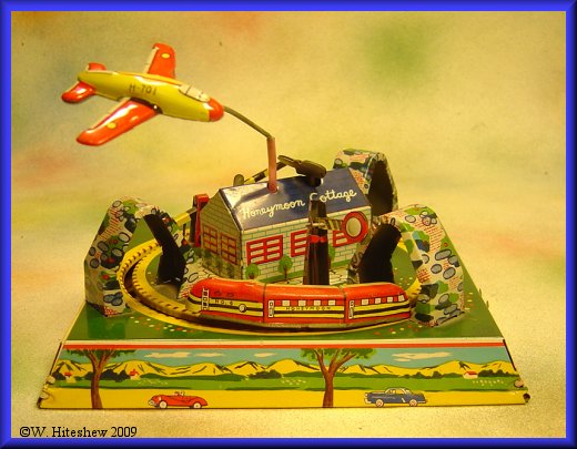 NOTES-------------Postwar version of the popular Marx Honeymoon Express produced by Linemar (Marx Japan). Great action as the train races around the "track" tripping the semaphore and crossing gate as the plane circles overhead. This version with the airplane, is much more rare.