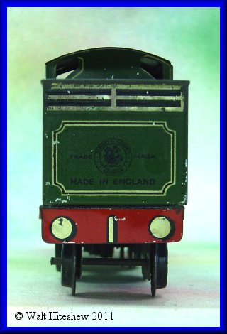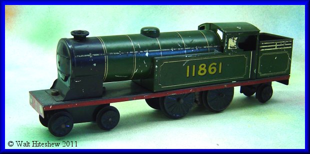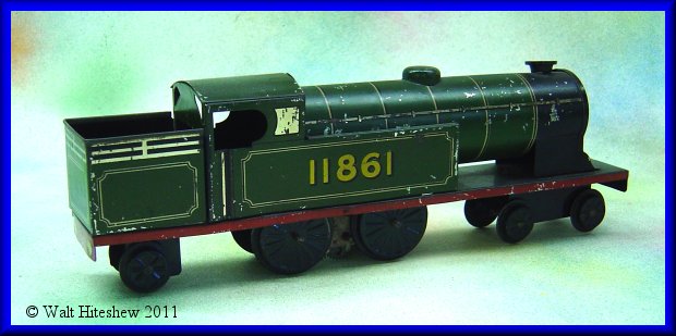 NOTES-------------Clockwork powered floor toy engine made England probably prewar, I would guess 1930's by the design. 10" LONG. Motor utilizes small wire coil spring typical of inexpensive toys from that era.