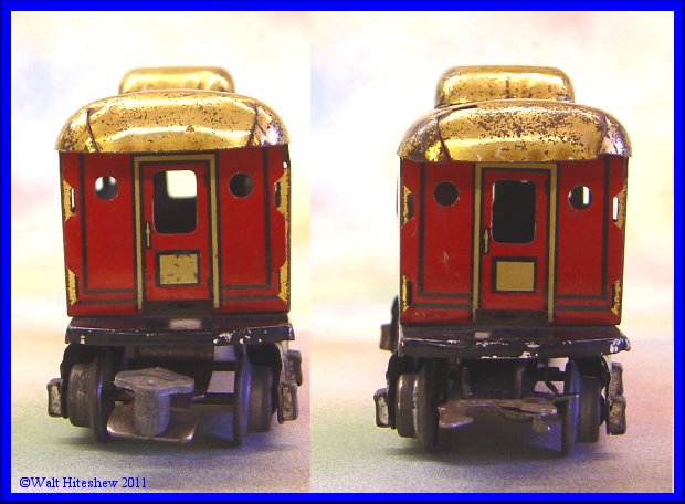 NOTES------------This caboose first surfaced in the mid nineties. I purchased it at the time knowing it was something that could not be faked. Although it is not lettered as a prototype there is no doubt this came from the Marx R&D department. Discussions between Marx collectors have concluded this was probably fabricated at the time Marx produced the copper/brass CP engine and tender. They were probably considering a caboose to match the set. Why it never got past the R&D department is unknown but it is likely they rejected it as too gaudy. There is no doubt about this item originating at Marx and not in some collector's basement. The slot for Joy Line couplers on the ends indicates this to be from the 1938 era, just when it would be expected. The body and cupola are regular stampings but from the brass/copper sheet as used on the brass/copper tenders. Ends, frame, trucks, and couplers are regular production.