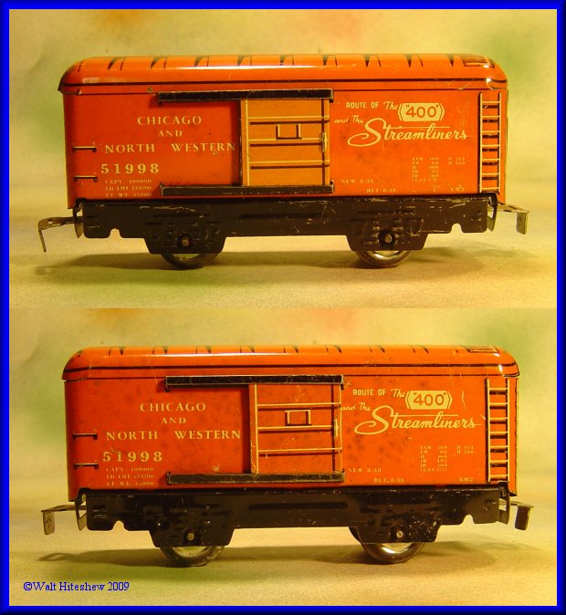 CONDITION-----VERY GOOD. Engine shows more playwear than rest of set. Hard-to-find orange CNW boxcar has some discoloration. Box is water damaged. Both ends missing from top and bottom is water damaged on one end.
