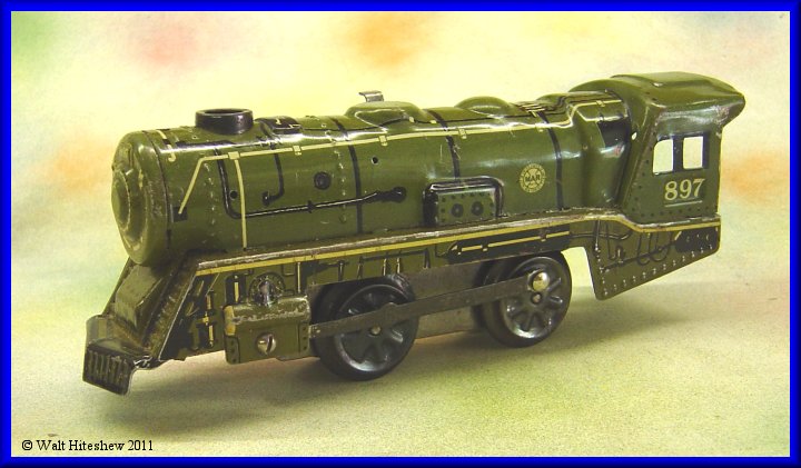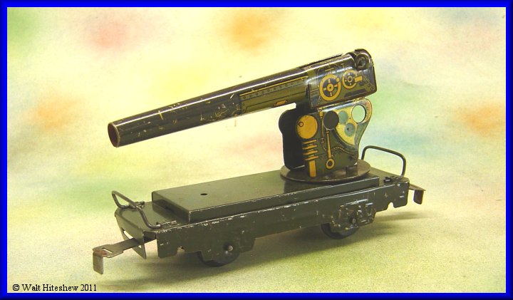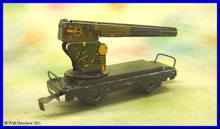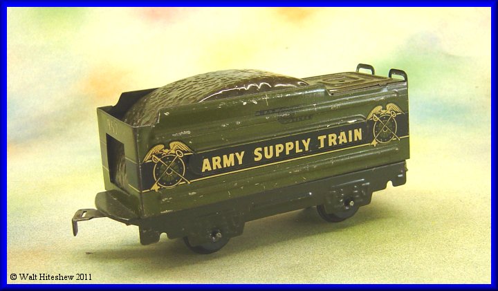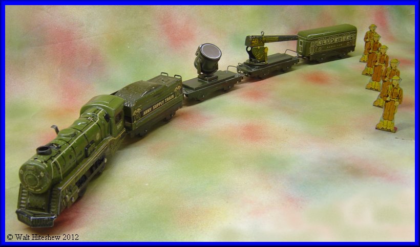 NOTES---------Rarest of the Military sets. The most common piece in this set is the Army Supply Train wedge tender and that is certainly not a common piece. Dummy searchlight, A-A Gun and Radio car with sliding tab and slot couplers cannot be faked. Very rare set and a gem in any Marx collection.