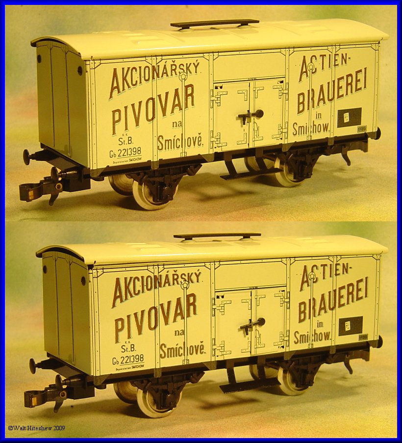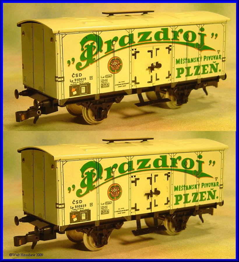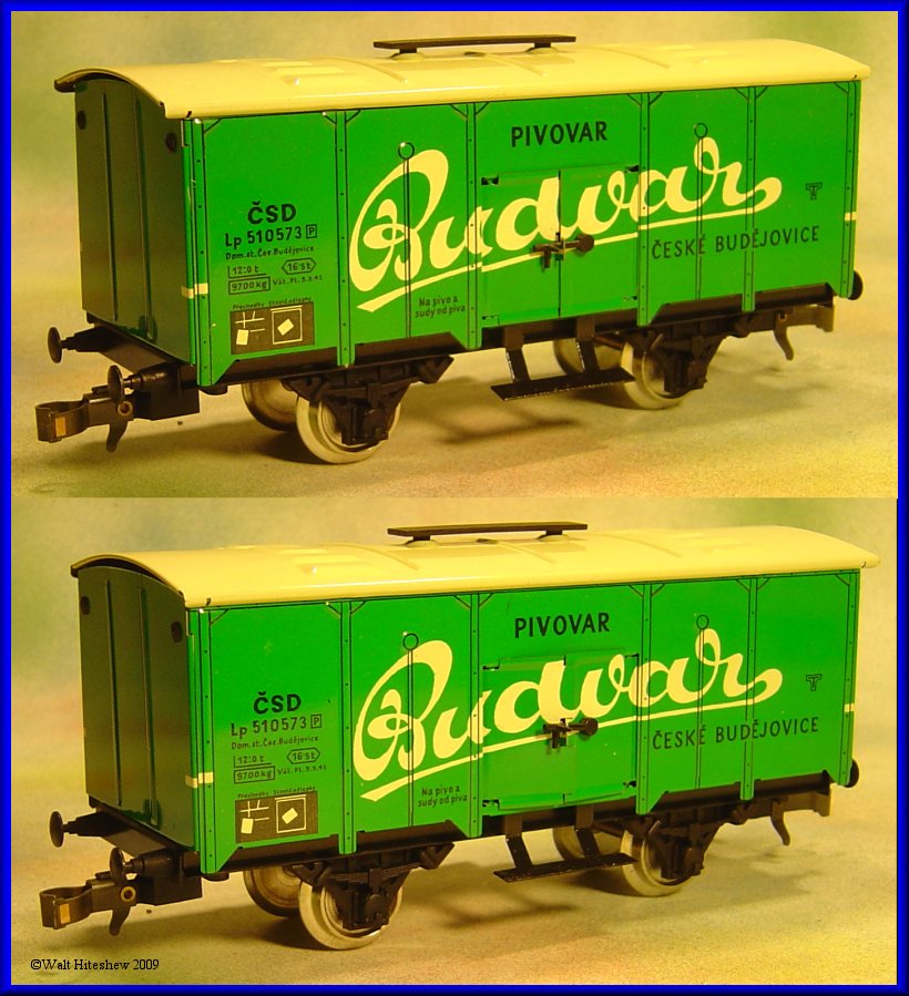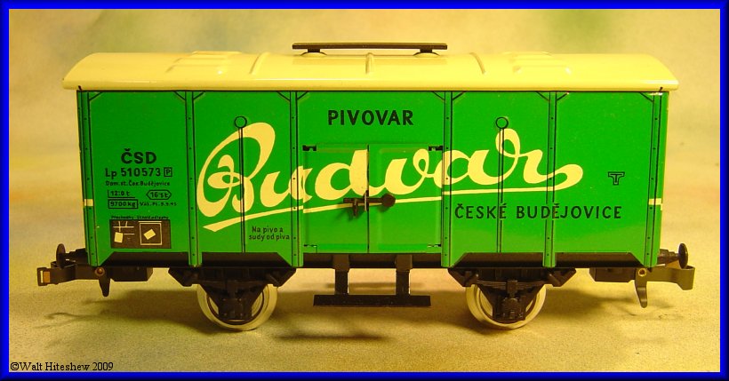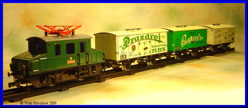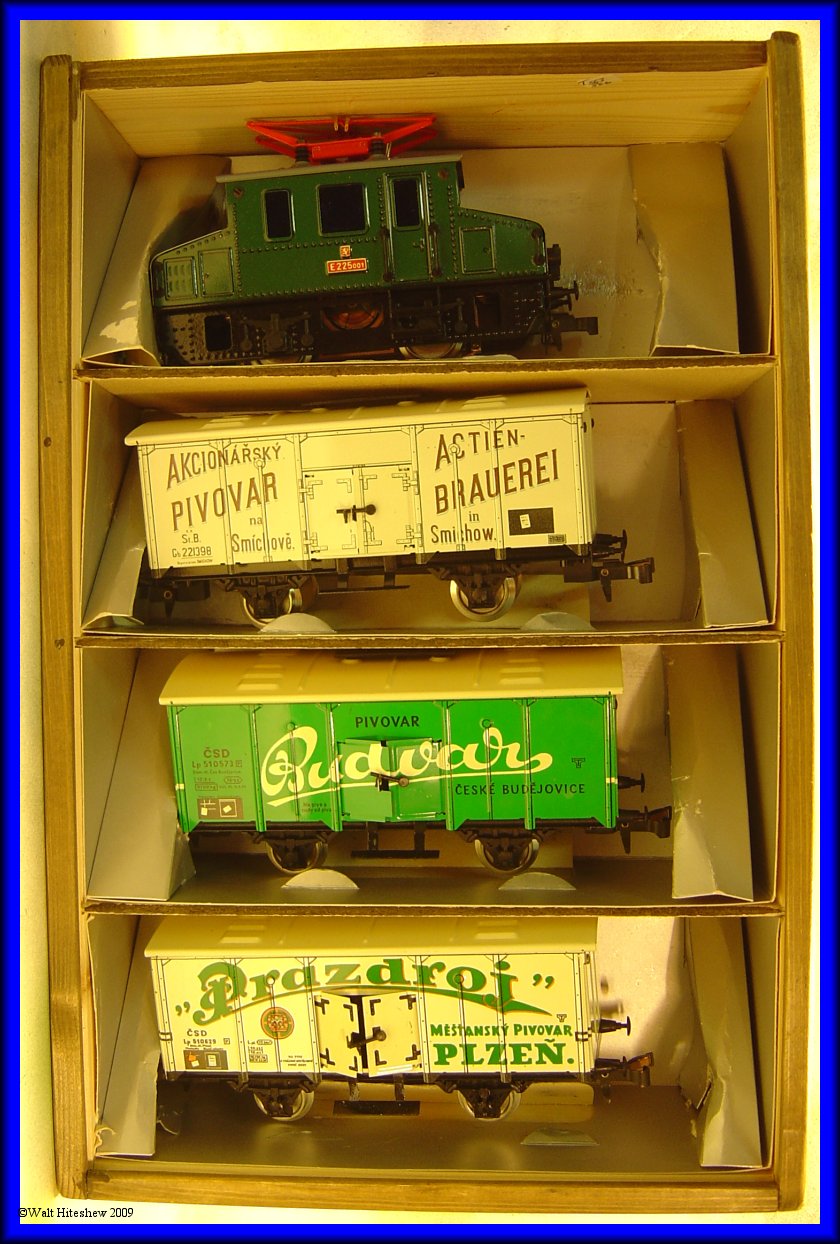 NOTES------Absolutely gorgeous Czech made electric O gauge beer train. This is intended for O gauge track although I bought this new and have never run it. Engine has working pantograph, open frame 5 pole motor, brass gears, and it appears to have directional headlamps (not sure as I have never even energized the set). Set is lithographed tin with only a very few plastic parts, including window panes, insulators, frame springs, and coupler springs. This is quality like hasn't been made in the USA for a very long time! Engine even has a tiny toggle switch on top which I had never noticed until now. I am not excited about selling this set!