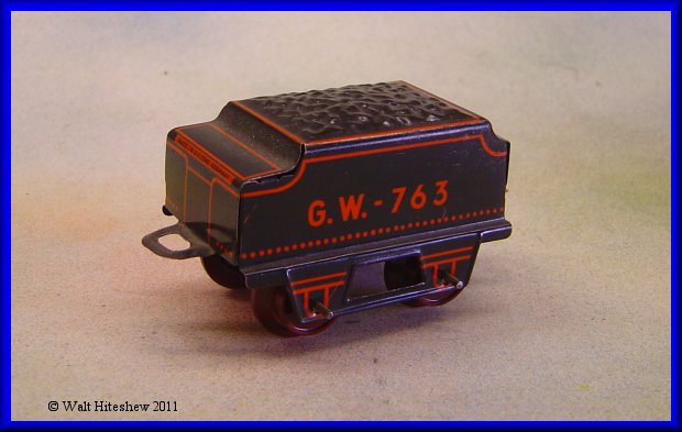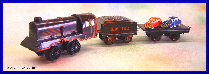 NOTE--------------Adorable little postwar O gauge German set put together from accumulated pieces. This set probably is legit but I purchased the items separately. The consist is similar to boxed sets I have in my collection. Set measures 13-1/2" total. Little automobiles are held in place by rubberbands which have deteriorated away. Remnants left underneath flat.