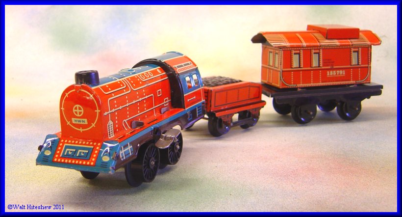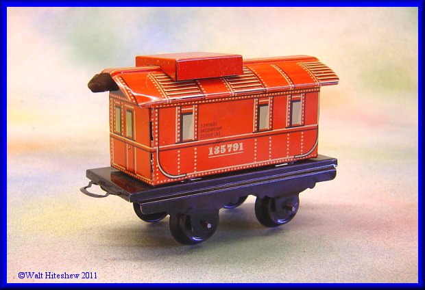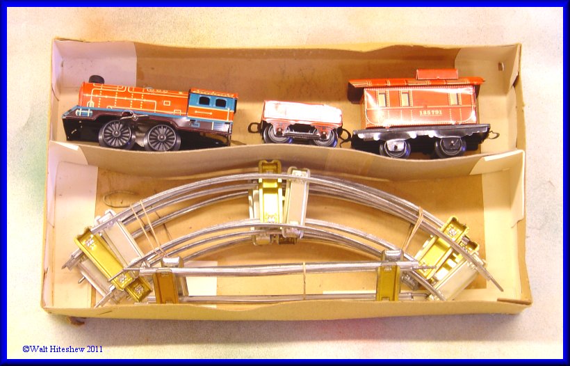 NOTE--------------Beautiful tiny O gauge German set with unusual cupola on caboose. No litho design. Not often seen. Set measures 13" overall.