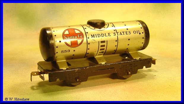 NOTES------------Rare car with black painted ends and dome, produced either 1940 or 40 only when tin was in short supply. Frame is thinner sheet metal indicating reused body material. Black wheels. This is the only one of these I have seen from a clockwork set.