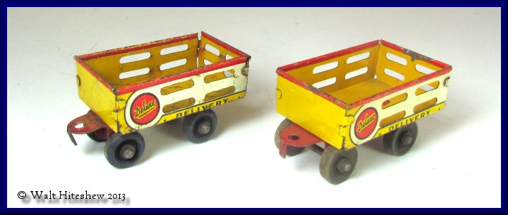 CONDITION-----VERY GOOD PLUS. Truck and first cart show light playwear. Last cart has different wheels and shows some light corrosion inside.