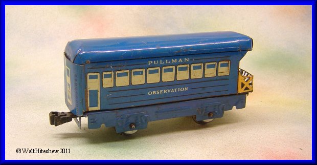 NOTES------------Marx blue passenger cars have always been hard to find. Sold with the blue Mercury sets in the early 1950s, they typically are equipped with sliding tab and slot couplers. This one, with plastic knuckle couplers, is an over-the-counter item, not included in a set. Very hard to find, I have only seen a few of these in twenty plus years of collectng Marx trains. Also somewhat odd is the blue frame. Blue frames are generally found in sets which were all clockwork and would have been equipped with sliding tab and slot couplers. OTC cars usually have black frames.