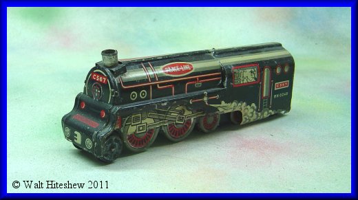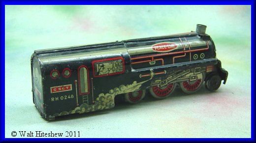 NOTES-------------Interesting friction powered floor toy engine made in Japan. I suspect this is late prewar made during anti-Japanese propaganda period leading up to WWII. Thus, "Peace Line". 7-1/2" long. Very interesting graphics. Logo unknown.
