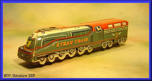 NOTES-------------One of a series of Marusan friction powered floor trains apparently made using the same tooling as the Marx versions, with the addition of a metal bottom. 8-1/2" long.