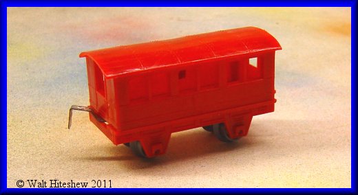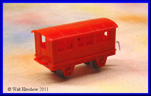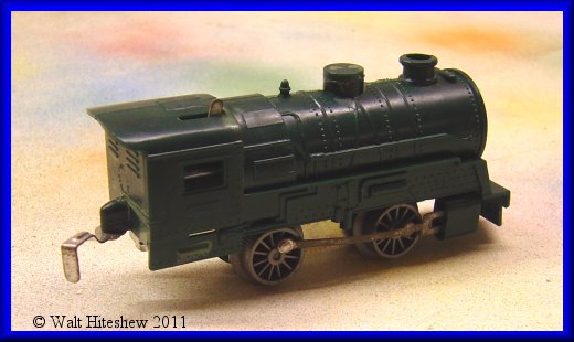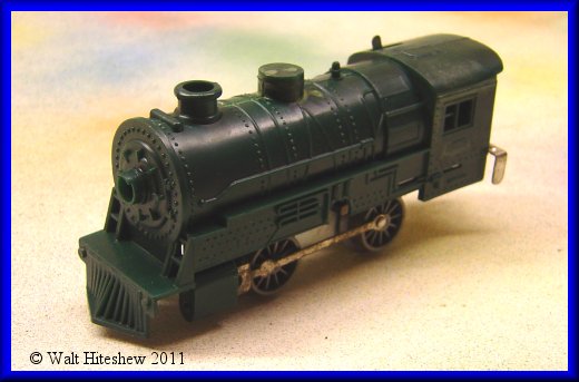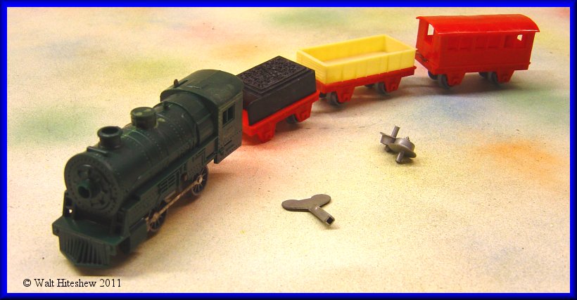 NOTES-------------Interesting and unusual small plastic set, probably from the fifties. Nonimally HO. These are usually battery ops but this one has a nice strong clockwork motor.