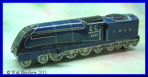 NOTES-------------Clockwork powered floor toy engine made England probably postwar, I would guess 1950's by the design. 9" Long. Manufacturer unknown but I suspect Mettoy.