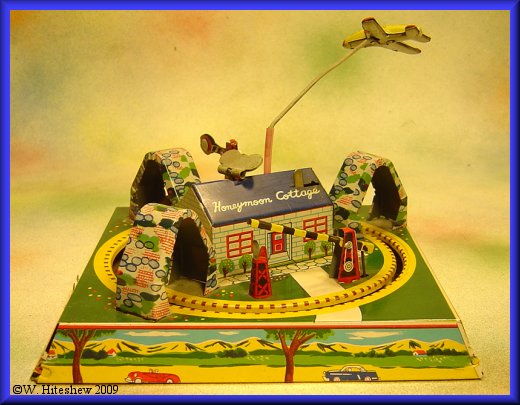 NOTES-------------Postwar version of the popular Marx Honeymoon Express produced by Linemar (Marx Japan). Great action as the train races around the "track" tripping the semaphore and crossing gate as the plane circles overhead. This version with the airplane, is much more rare.